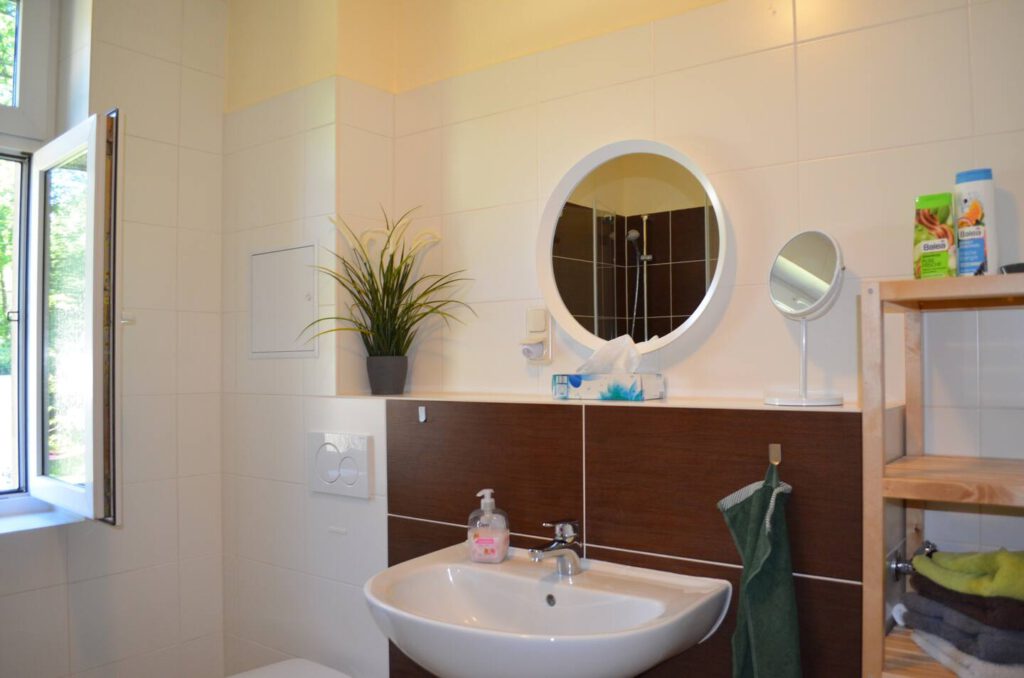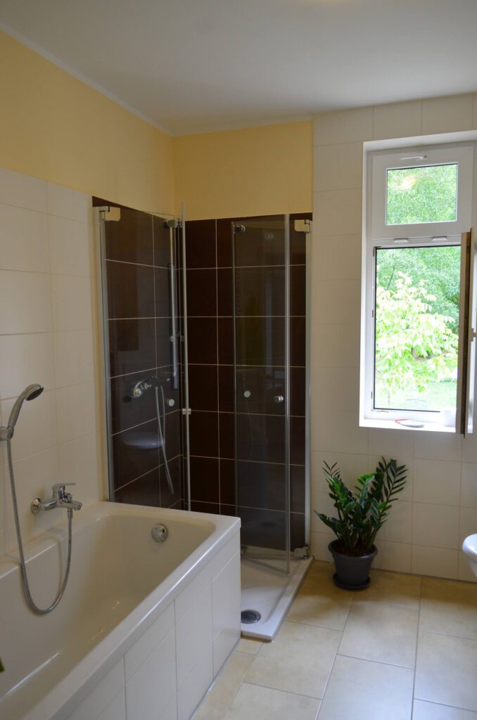 Bad mit Dusche, Wanne, WC, Haartrockner, WC-Aufsatz und Hocker für unsere kleinen Gäste