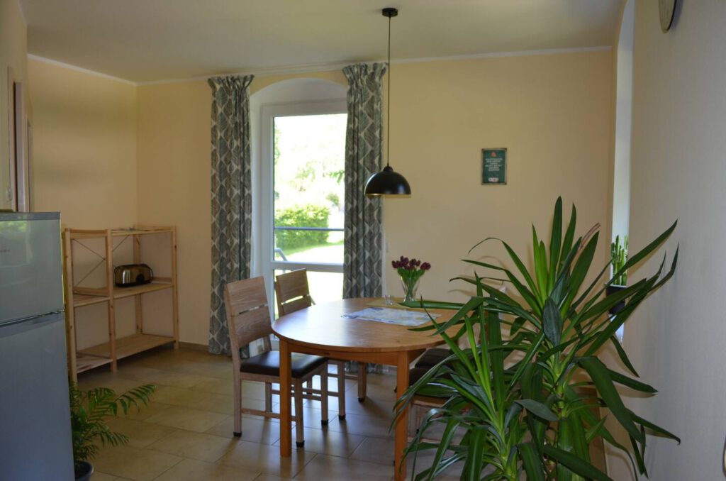 große Küche mit Essplatz für bis zu 6 Personen und einem großen Abstellregal
