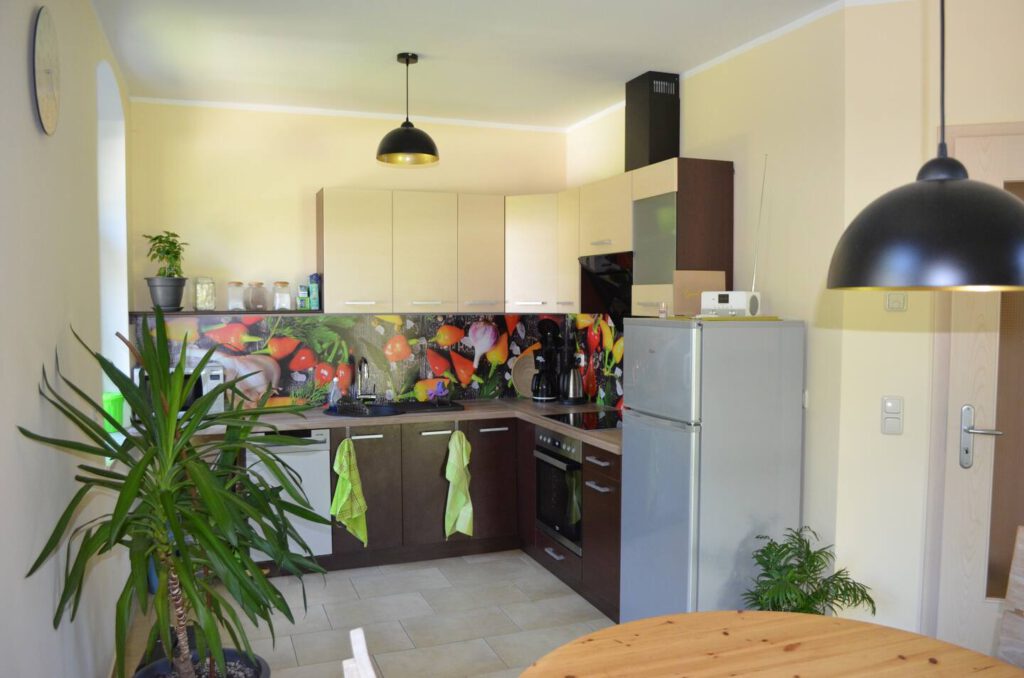 Küche mit Kühl- Gefrierkombi, Backofen, Kochfeld, Kaffeemaschine, Wasserkocher, Geschirrspüler und Mikrowelle