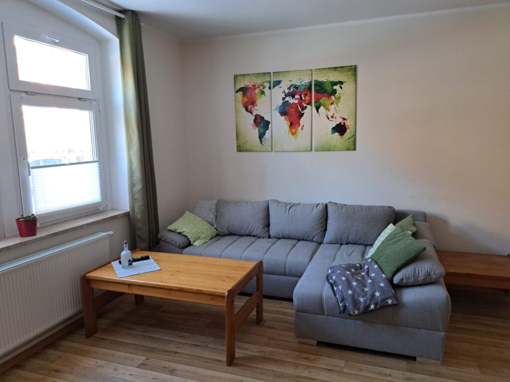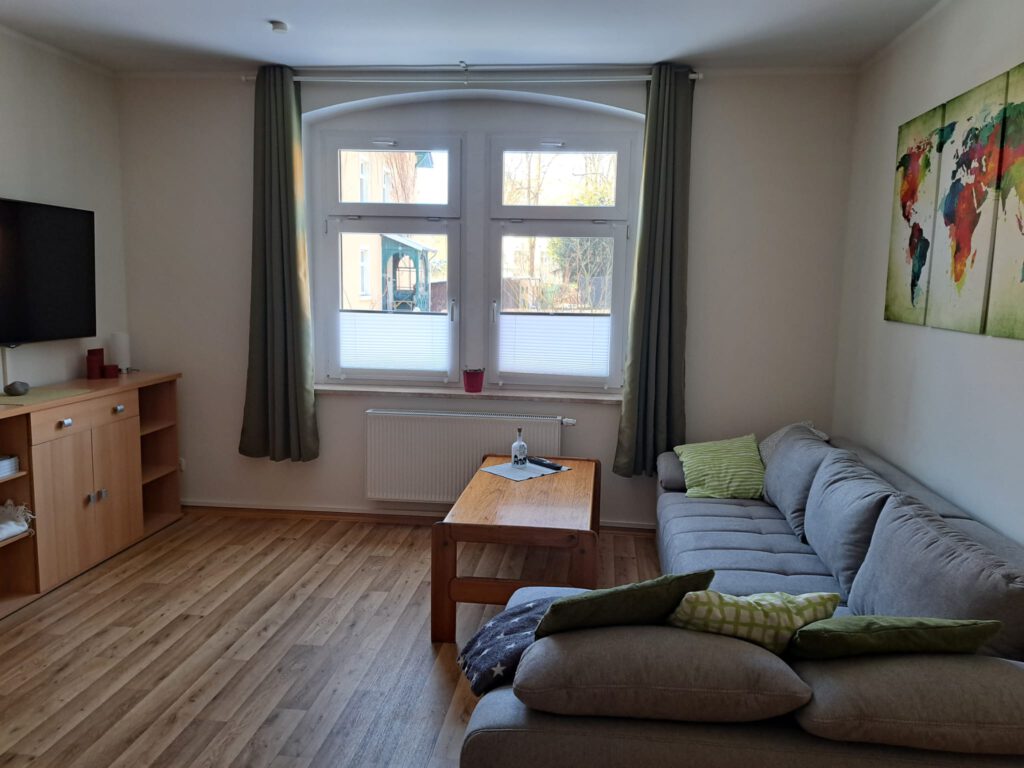 Wohnzimmer mit Smart-TV und ausziehbarer Schlafcouch